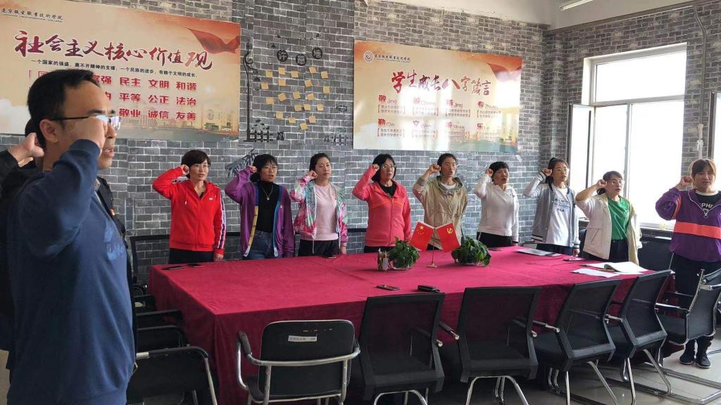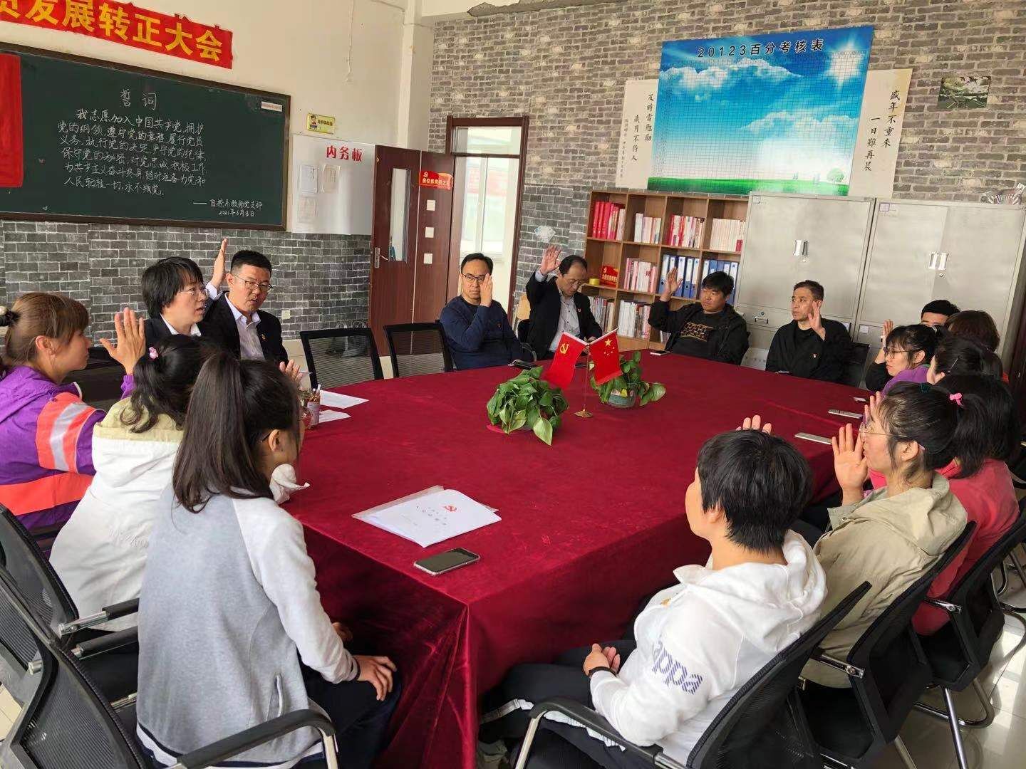 最后,全体党员在庄严的党旗下宣誓,重温入党誓词,党支部书记谢海洋总结讲话,希望张颖加入党组织后有更高的政治追求,时刻严格要求自己,工作中以身作则、率先垂范,坚定理想信念,加强理论学习,无愧党员称号。